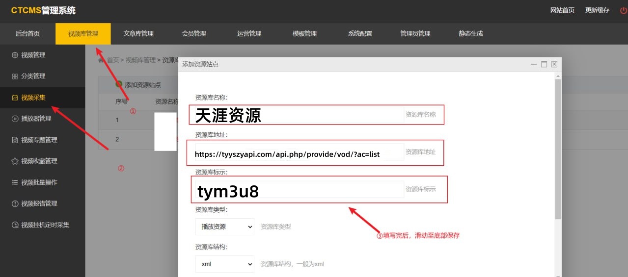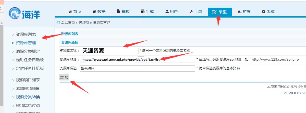 请按以下步骤进行:依次点击【采集】-【采集资源库管理】,然后依次输入