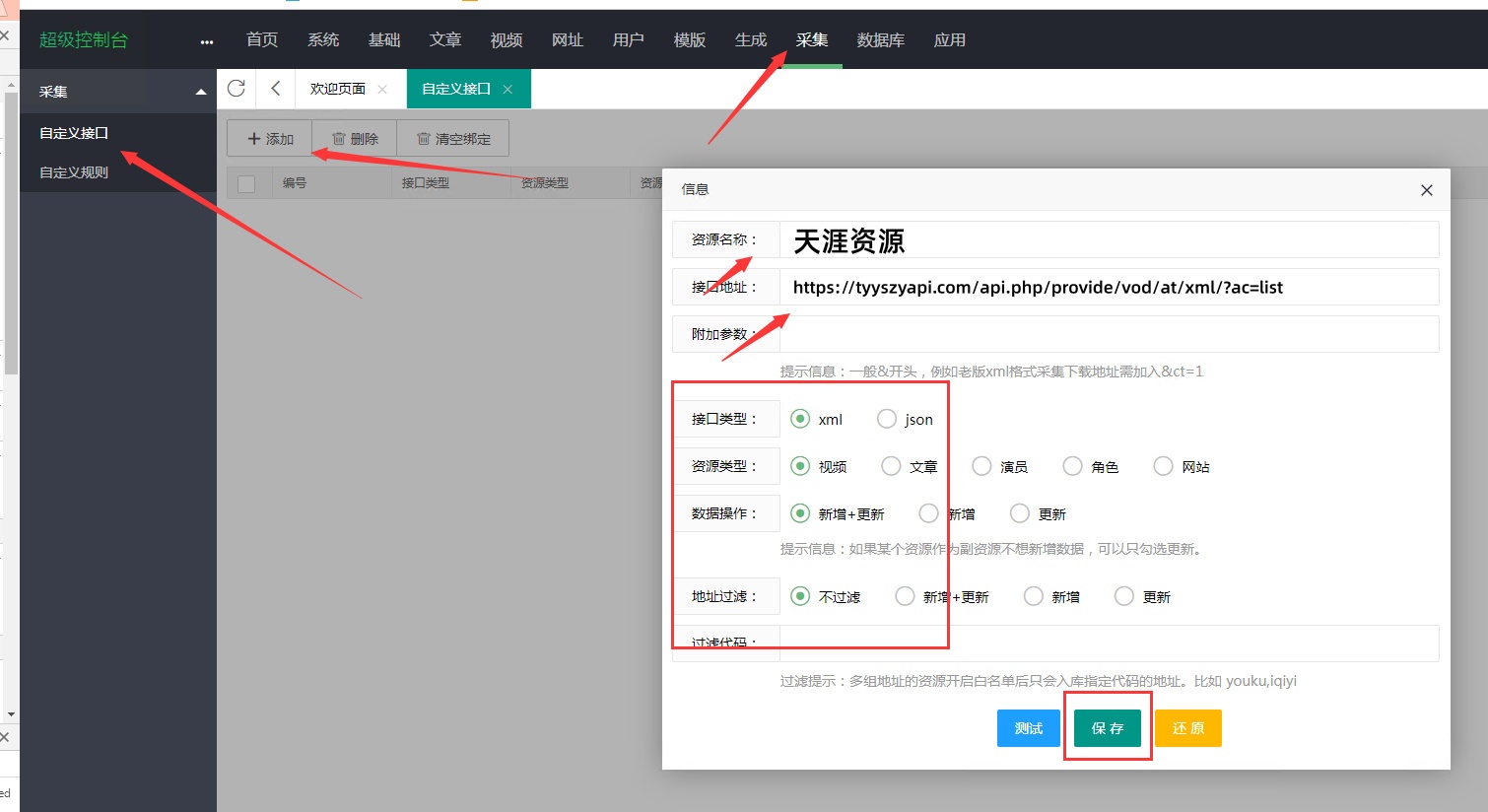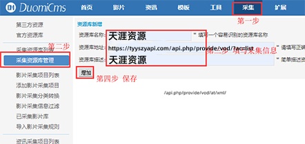 请按以下步骤进行:依次点击【采集】-【添加资源库】,然后依次输入