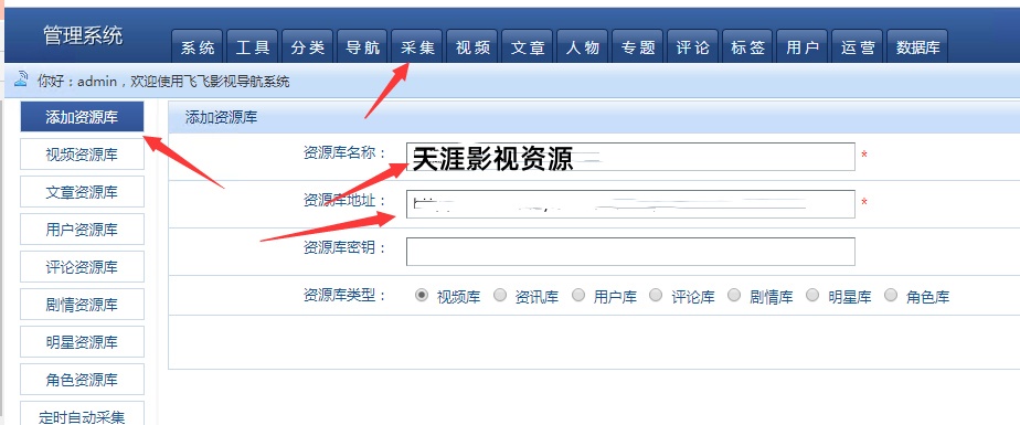 请按以下步骤进行:依次点击【采集】-【资源库管理】,然后依次输入