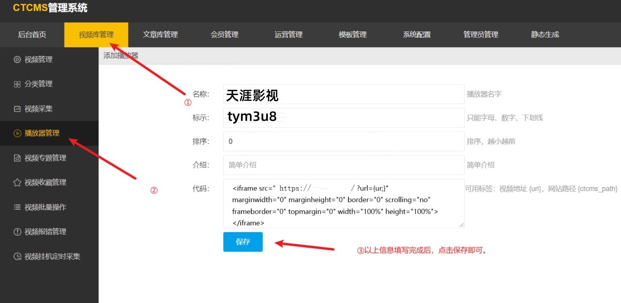 需要先再网站后台添加对应的播放器,才可以实现播放。下载文件解压后按下图操作【下载播放器文件】