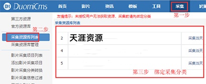 需要采集时,依次点击【采集】-【采集资源库列表】-天涯影视资源站具体操作如下图