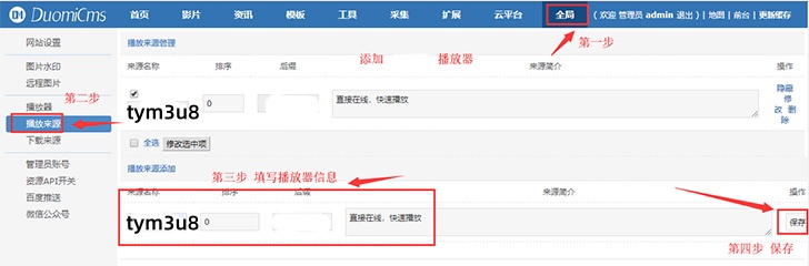 需要先再网站后台添加对应的播放器,然后再安装对应的播放器文件,才可以实现播放,以tym3u8的资源为例
