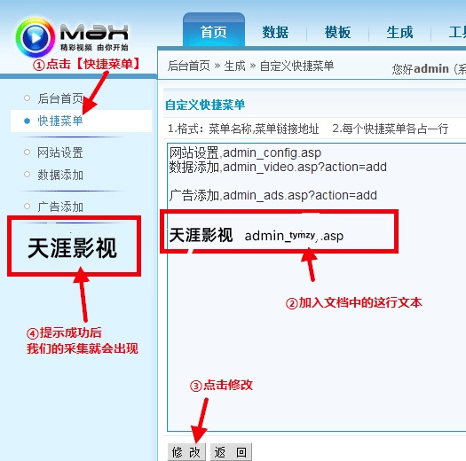 • 采集方法:视频库管理->视频采集->天涯影视资源采集